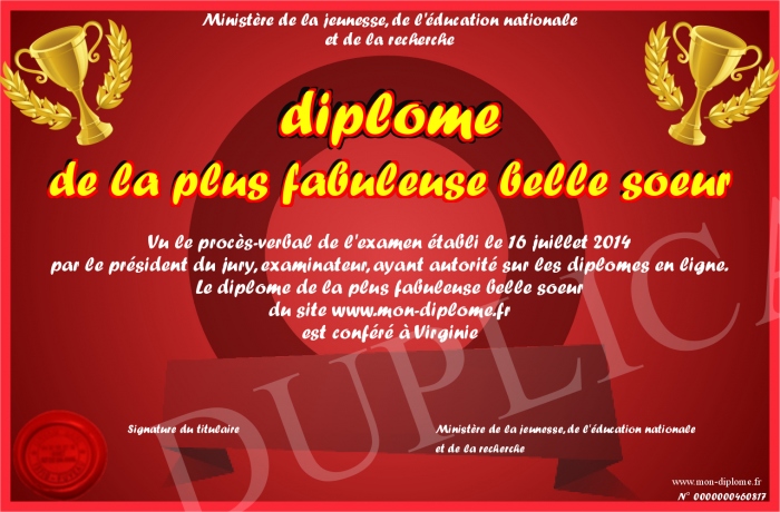 Envoyez par email votre diplome de la plus fabuleuse belle soeur personalisé
