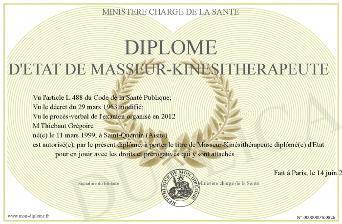 Envoyez par email votre Diplôme d'Etat de Masseur-Kinésithérapeute personalisé