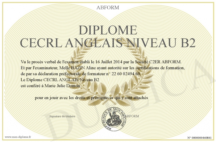 Envoyez par email votre Diplôme CECRL ANGLAIS Niveau B2 personalisé