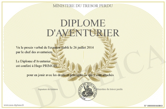 Envoyez par email votre Diplôme d'Aventurier personalisé