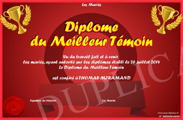 Envoyez par email votre Diplôme du Meilleur Témoin personalisé