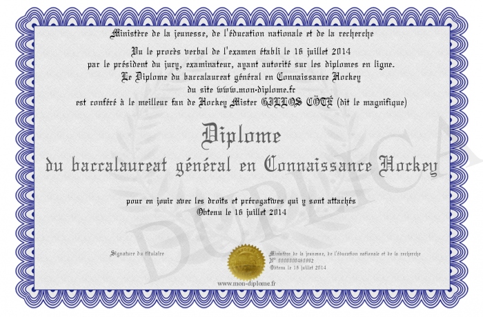 Envoyez par email votre Diplôme du baccalaureat général en Connaissance Hockey personalisé
