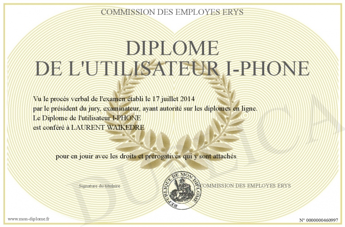 Envoyez par email votre Diplôme de l'utilisateur I-PHONE personalisé