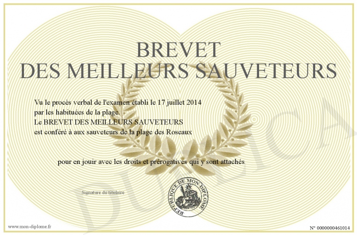 Envoyez par email votre BREVET DES MEILLEURS SAUVETEURS personalisé