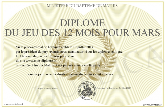 Envoyez par email votre Diplôme du jeu des 12 mois pour Mars personalisé