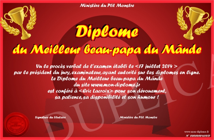Envoyez par email votre Diplôme du Meilleur beau-papa du Mânde personalisé