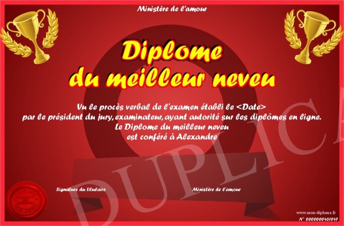 Envoyez par email votre Diplôme du meilleur neveu personalisé