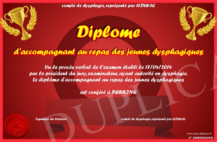 Envoyez par email votre Diplôme d'accompagnant au repas des jeunes dysphagiques personalisé