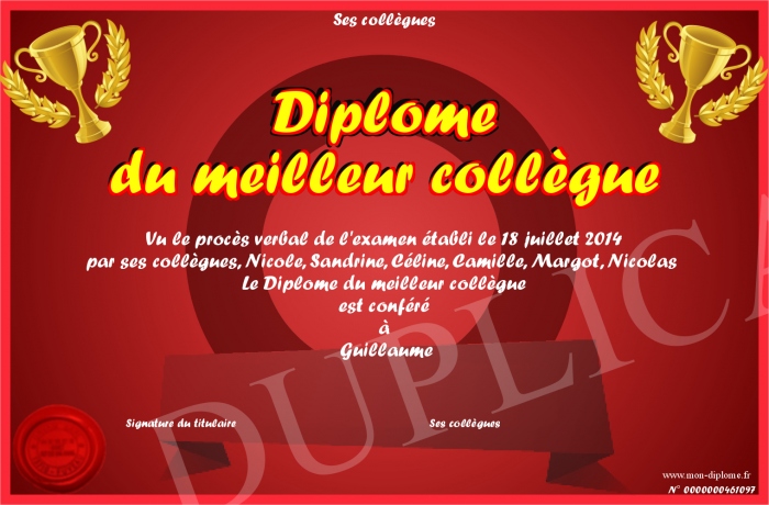 Envoyez par email votre Diplome du meilleur collègue personalisé