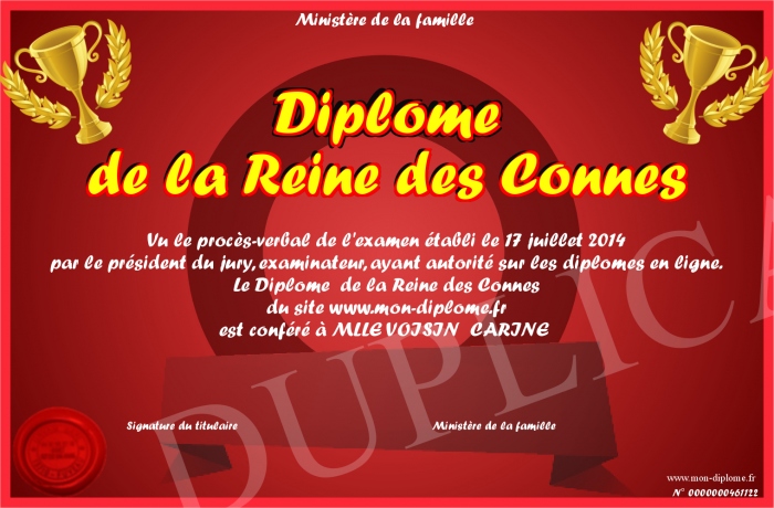 Envoyez par email votre Diplôme de la Reine des Connes personalisé