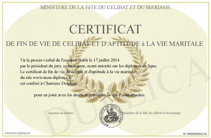Envoyez par email votre certificat de fin de vie de célibat et d'aptitude à la vie maritale personalisé