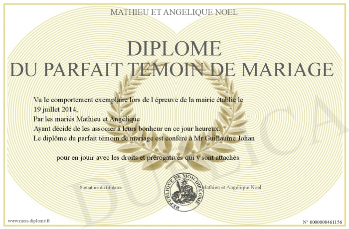 Envoyez par email votre Diplôme du parfait témoin de mariage personalisé