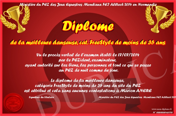 Envoyez par email votre Diplôme de la meilleure danseuse, cat. FreeStyle de moins de 35 ans personalisé