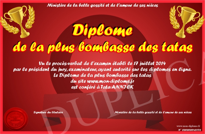 Envoyez par email votre Diplôme de la plus bombasse des tatas personalisé