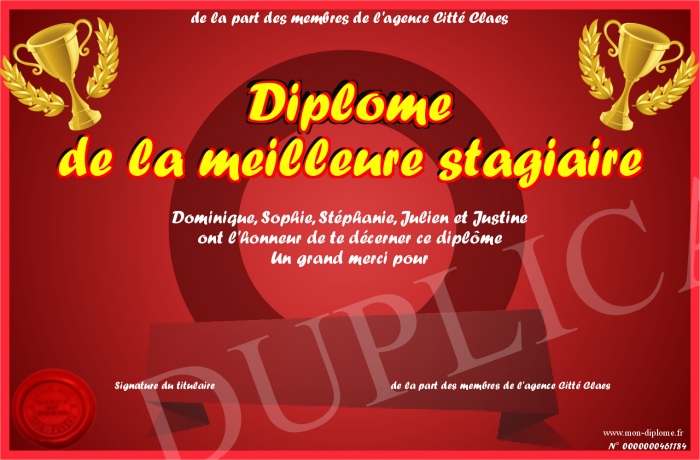 Envoyez par email votre Diplôme de la meilleure stagiaire personalisé