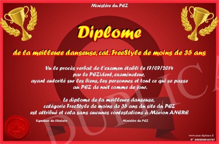 Envoyez par email votre Diplôme de la meilleure danseuse, cat. FreeStyle de moins de 35 ans personalisé