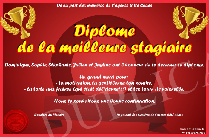 Envoyez par email votre Diplôme de la meilleure stagiaire personalisé