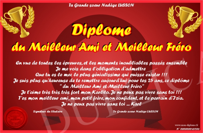 Envoyez par email votre Diplôme du Meilleur Ami et Meilleur Fréro personalisé