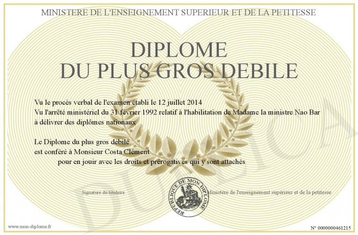 Envoyez par email votre Diplôme du plus gros débile personalisé