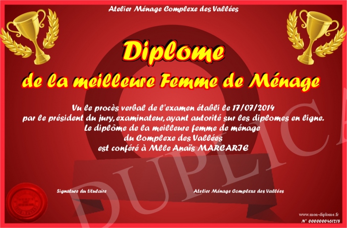 Envoyez par email votre Diplôme de la meilleure Femme de Ménage personalisé