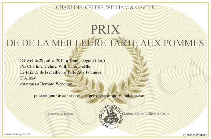 Envoyez par email votre Prix de de la meilleure Tarte Aux Pommes personalisé