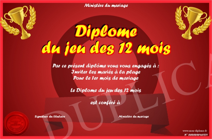 Envoyez par email votre Diplôme du jeu des 12 mois personalisé