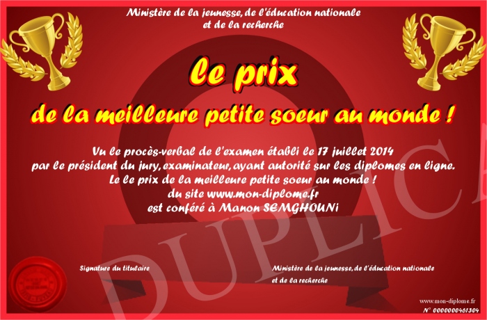 Envoyez par email votre le prix de la meilleure petite soeur au monde ! personalisé