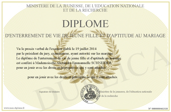 Envoyez par email votre Diplôme d'enterrement de vie de jeune fille et d'aptitude au mariage personalisé