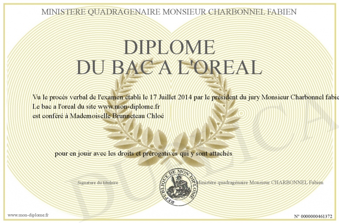 Envoyez par email votre Diplome du bac a l'oréal personalisé