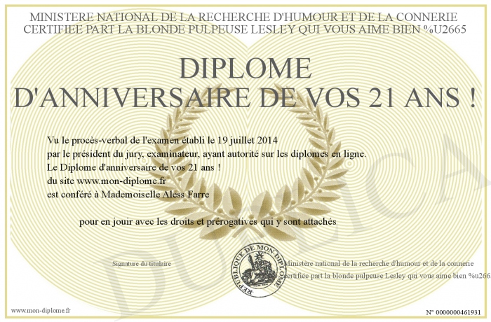 Envoyez par email votre Diplôme d'anniversaire de vos 21 ans ! personalisé