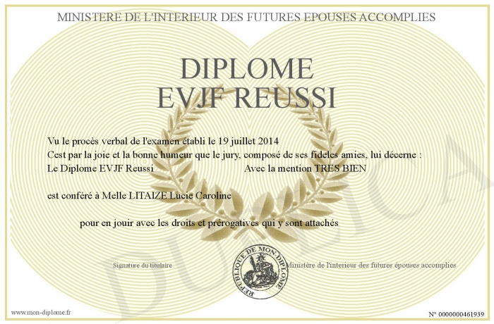 Envoyez par email votre Diplôme EVJF Reussi personalisé