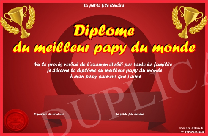 Envoyez par email votre Diplôme du meilleur papy du monde personalisé