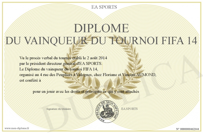 Envoyez par email votre Diplôme du vainqueur du tournoi FIFA 14 personalisé