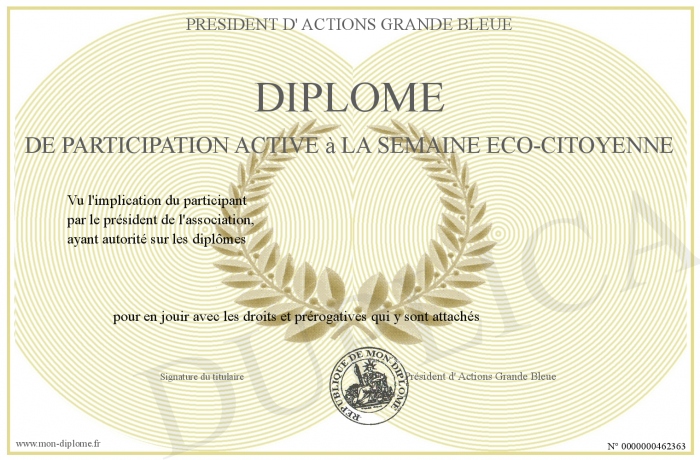 Envoyez par email votre Diplôme de participation active à la semaine éco-citoyenne personalisé