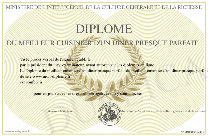 Envoyez par email votre Diplôme du meilleur cuisinier d'un dîner presque parfait personalisé
