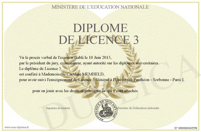 Envoyez par email votre diplôme de Licence 3 personalisé