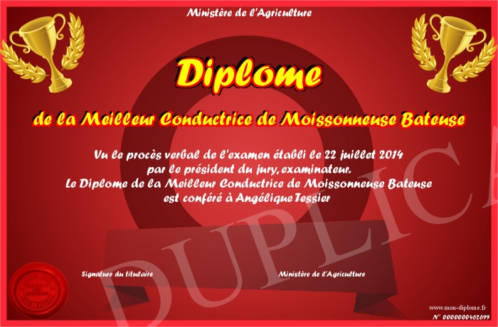 Envoyez par email votre Diplôme de la Meilleur Conductrice de Moissonneuse Bateuse personalisé