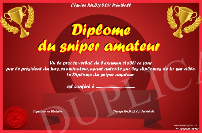 Envoyez par email votre Diplôme du sniper amateur personalisé