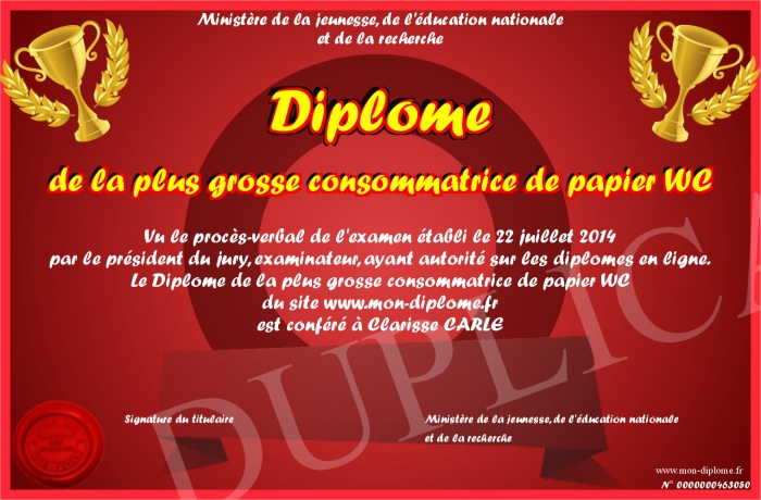 Envoyez par email votre Diplôme de la plus grosse consommatrice de papier WC personalisé