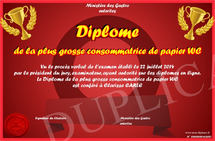 Envoyez par email votre Diplôme de la plus grosse consommatrice de papier WC personalisé