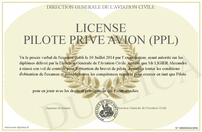 Envoyez par email votre LICENSE PILOTE PRIVE AVION (PPL) personalisé