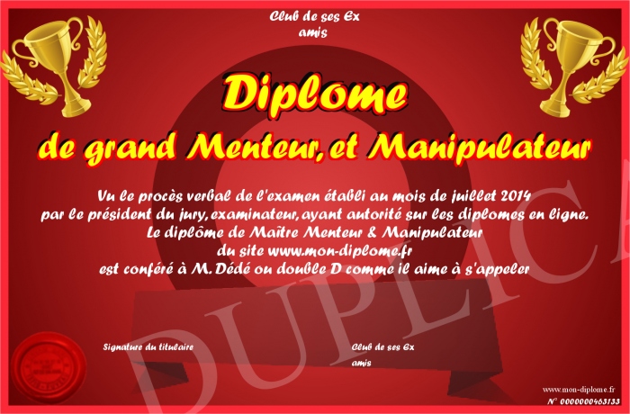 Envoyez par email votre Diplôme de grand Menteur, et Manipulateur personalisé