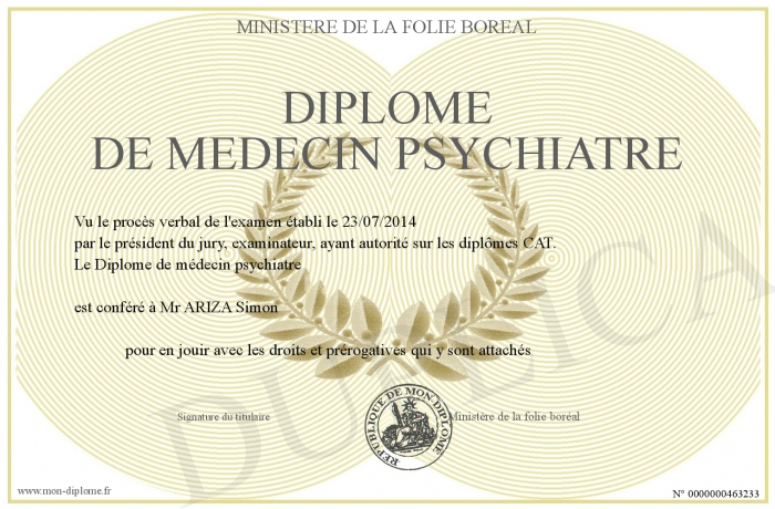 Envoyez par email votre Diplôme de médecin psychiatre personalisé