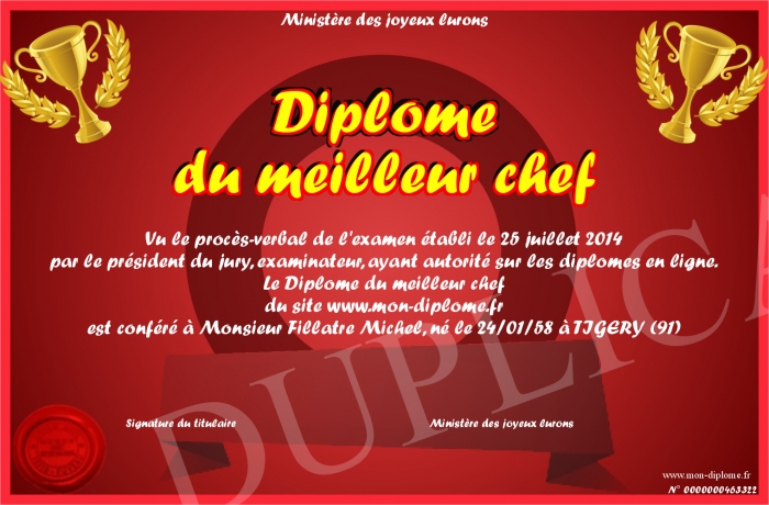 Envoyez par email votre Diplôme du meilleur chef personalisé