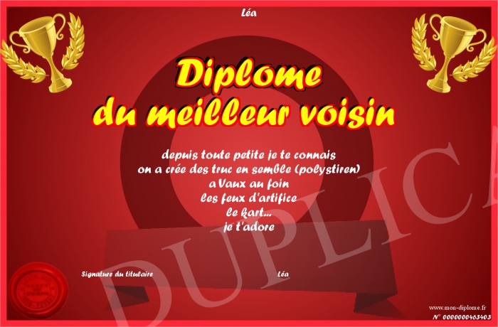• Diplôme du meilleur voisin