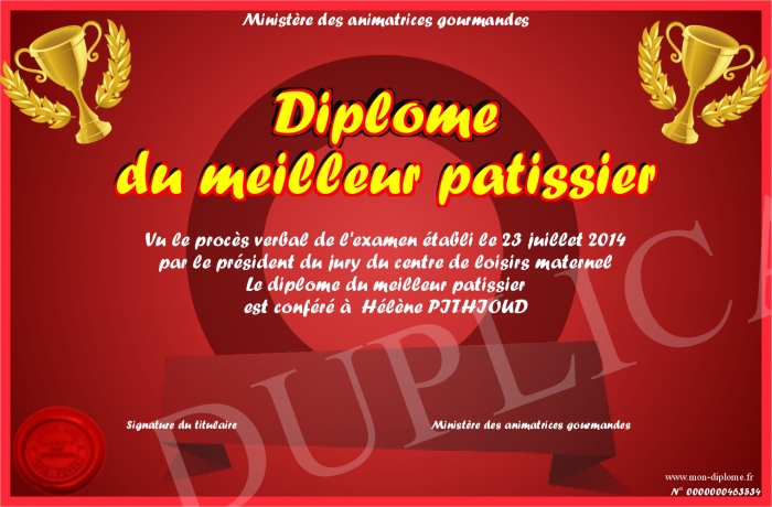Envoyez par email votre Diplôme du meilleur patissier personalisé