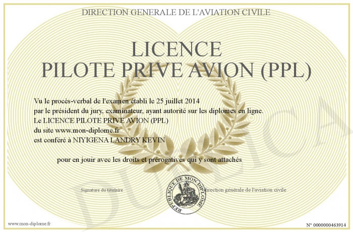 Envoyez par email votre LICENCE PILOTE PRIVE AVION (PPL) personalisé
