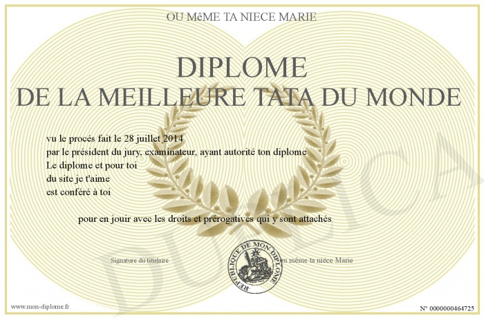 Envoyez par email votre Diplôme de la meilleure tata du monde personalisé