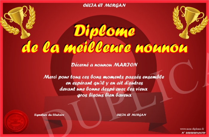 Envoyez par email votre Diplôme de la meilleure nounou personalisé