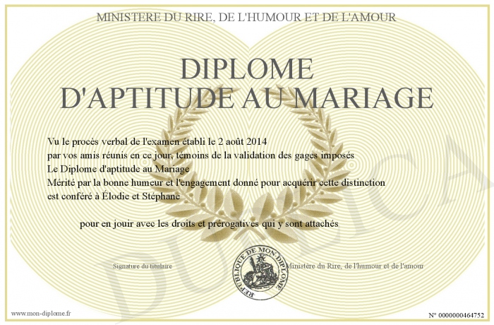 Envoyez par email votre Diplôme d'aptitude au Mariage personalisé